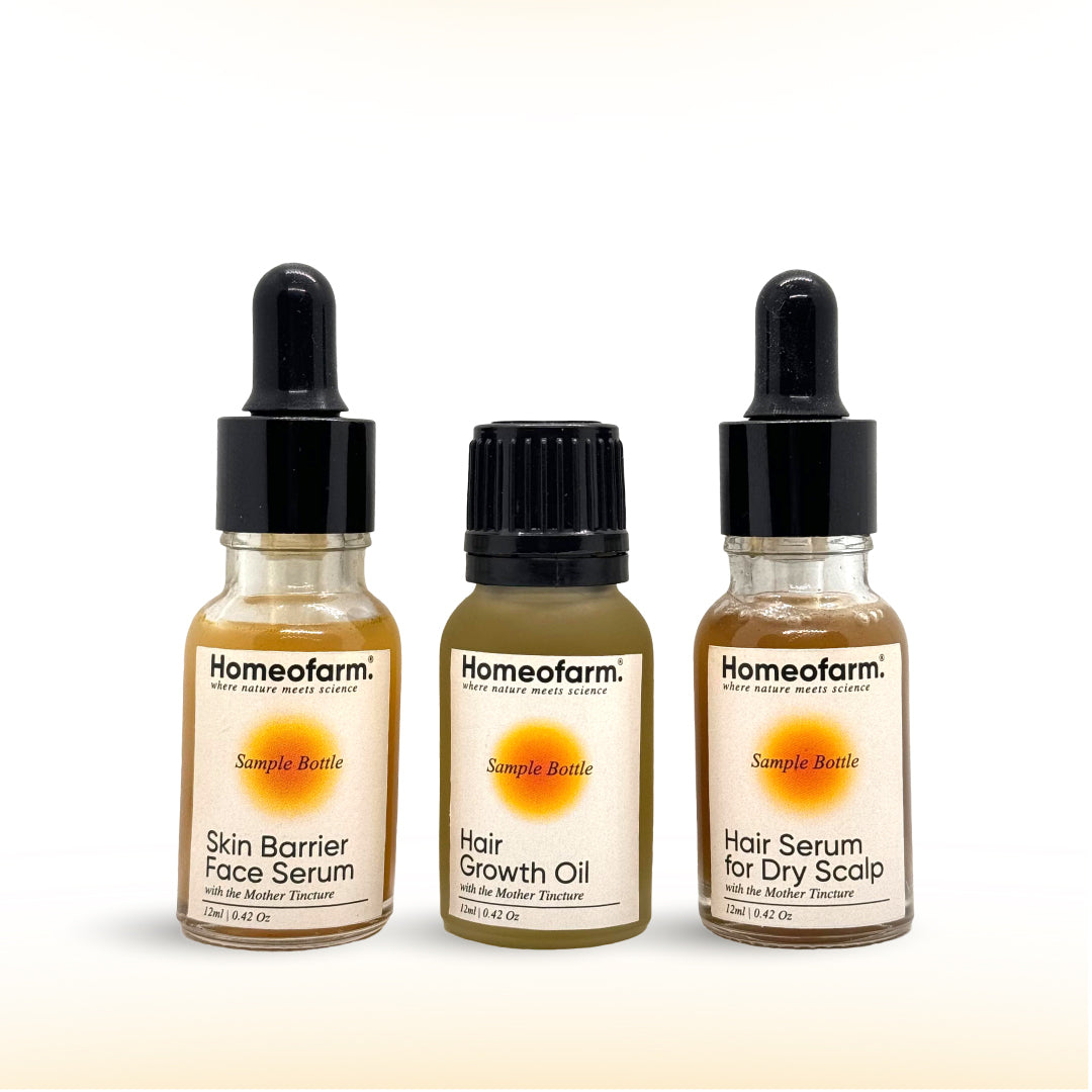 A sample pack of 12ml each of Hair Serum, Face Serum and Hair Oil.
